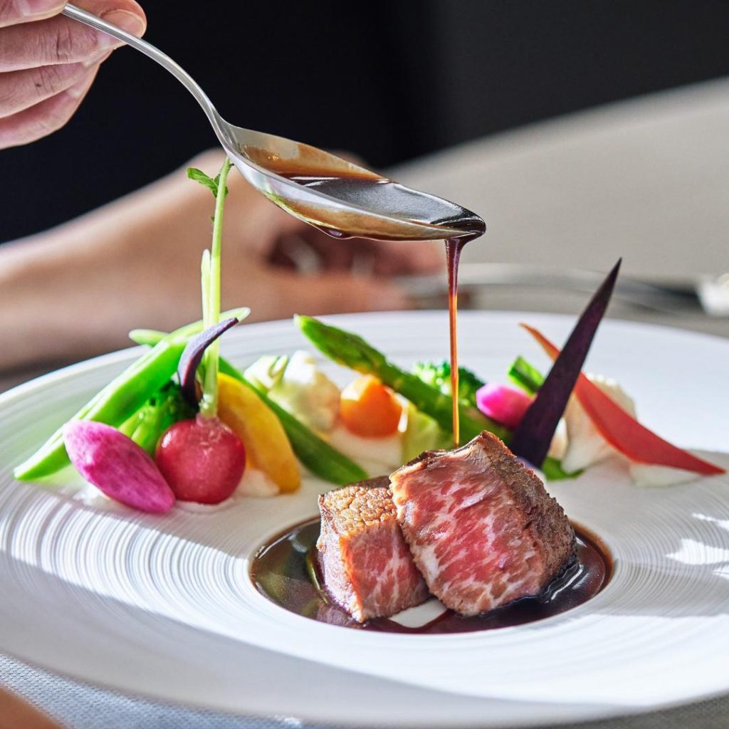 オマール・キャビアを使用した前菜、国産牛フィレのメインなど厳選コース全5品を無料試食 会場内のオープンキッチンから届く出来立てのお料理をゲスト目線で体験♪味だけでなく、音や香りまで楽しめるおもてなし料理はゲストからも好評。
